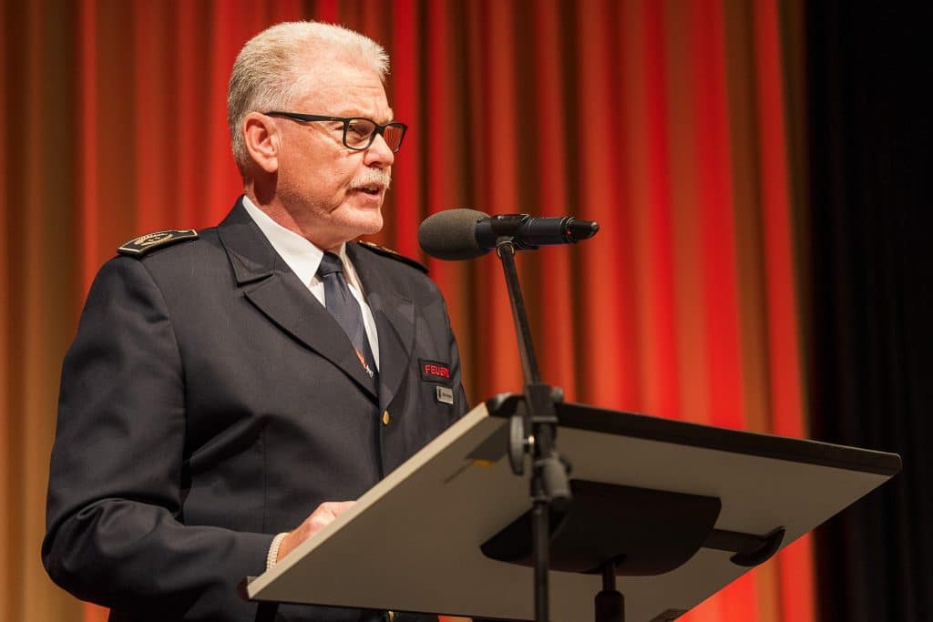 Gandelau berichtete über zentrale Entwicklungen der vergangenen zwei Jahre. Erstmals fand die Versammlung im neuen zweijährigen Rhythmus statt, nachdem die Satzungsänderung 2023 in Kraft trat. Besonders erwähnte er das erfolgreiche Treffen der Ehrenabteilung in 2024 sowie den neu eingeführten Eignungstest für Atemschutzgeräteträger, der die Ausbildungsorganisation verbessern und den Feuerwehrangehörigen einen sicheren Einstieg geben soll.